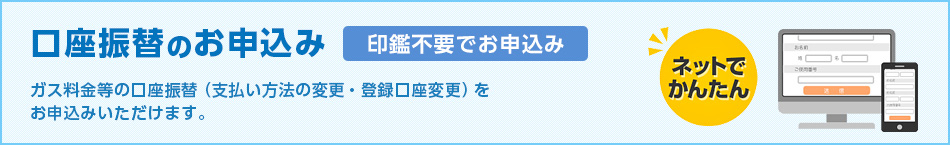 お支払い方法変更 口座振替への変更 クレジットカード払いへの変更 料金メニュー 一般料金 おトクな料金メニュー gas得プラン ガスの供給停止から再開まで お支払い期限について その他情報はガスtopへ.