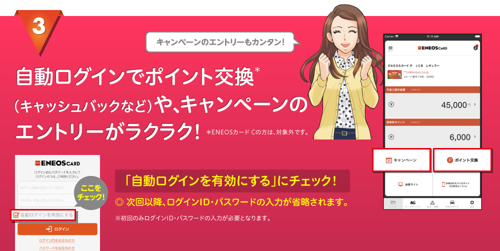 このアプリはトヨタファイナンス株式会社が発行するクレジットカード eneosカード の公式アプリです 本アプリは トヨタファイナンス株式会社発行のeneosカード会員さま かつ 会員さま専用webページ my ts3 マイティーエスキュービック へご登録の方に無料でご利用いただけます. カードのご入会にはトヨタファイナンス所定の審査がございます ご入会いただいたeneosカード c p s でのご利用分が割引対象です webサイトよりご入会をいただけない場合は本特典の対象とはなりません 値引き対象期間中にご利用サービスステーションからトヨタ. ご入会月を含め3カ月以内に eneosカードアプリログインと 条件 1 または条件 2 を達成で1 010ポイント 両方達成すると2 020ポイントプレゼント 条件 1 eneosカードで電気料金またはガス料金をお支払い.