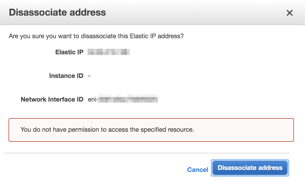 You do not have permission to access the specified resource elastic ip. I have a website that i am hosting on aws. The ec2 instance is stored in a vpc. If the option release address is greyed out it means that the ip address you ve selected is still associated with a resource. I am being billed for an elastic ip i am not using but i cannot release it.